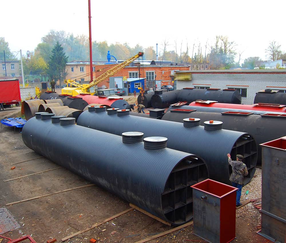 • Корпус изготовлен из низколегированной стали с многослойным антикоррозийным покрытием. Возможно изготовление из спирально-витого ПНД или стеклопластика.